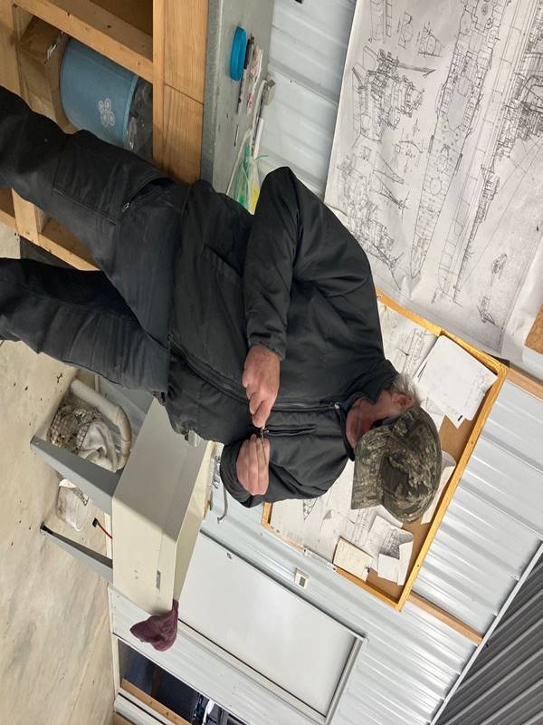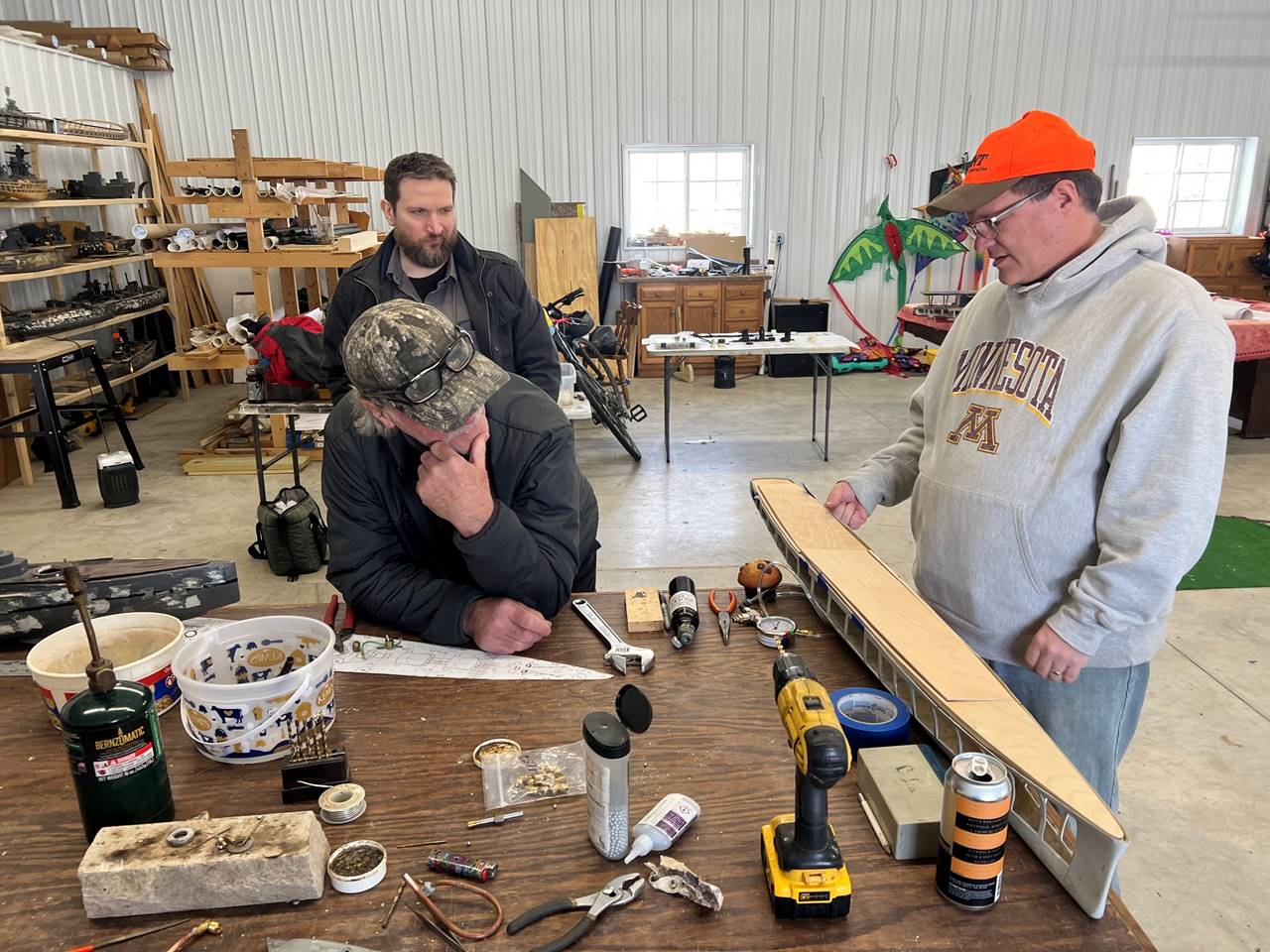 Matthew, Mike, and Bob admiring Tyler’s handy work with the USS Cleveland’s deck and subdeck. About to transition to working on Matthew’s guns.